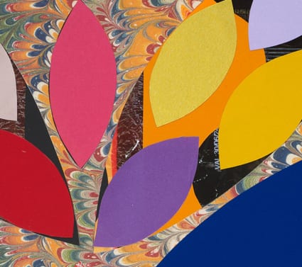 Collage has been integral to Milhazes’ practice since the outset of her career in the 1980s, when she first incorporated paper cut-outs, fabric and lengths of ribbon into her paintings. The introduction of her unique monotransfer technique (the layering of individual dried painted motifs on canvas) in 1989 allowed her to continue the principle of collage but with painted forms of her own making. In 2003, Milhazes returned to creating collages using papers and materials she collects, with several featured in her exhibition at Turner. By layering and combining varied materials— from sweet wrappers to shiny packaging and decorative marbled papers, Bolha de Sabão [Soap Bubble], 2024 embodies a visual journal reflecting Milhazes’ travels and daily life.