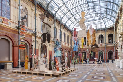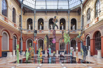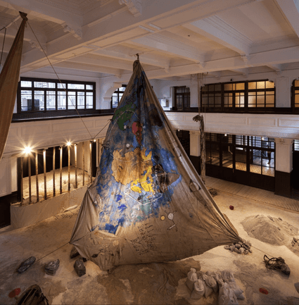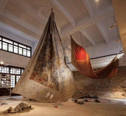 Boghiguian’s nomadic practice responds to specific locations, creating installations often likened to “giant pop-up books,” where spaces unfold as visitors navigate her installations.