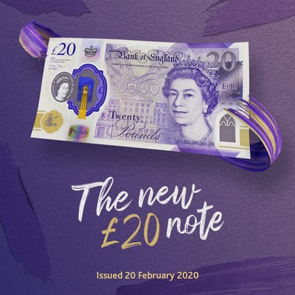 - A metallic hologram which changes between the word ‘Twenty’ and ‘Pounds’ when the note is tilted.