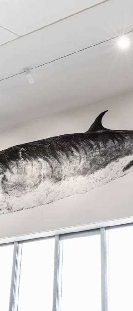 Using chalk collected from the beaches in Margate, Mixe has chosen to paint a life-sized Minke whale (Balaenoptera Acutorostrata), the most commonly seen whale around the UK coastline. Chalk is comprised from planktonic remains of micro-organisms: fossils believed to be 66 to 100 million years old. Using this material to draw such a giant creature is a way to show the connection between all living things.