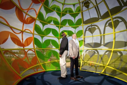 In 2021, Yinka Ilori began a three-month residency in Kings Hill, regularly visiting the area and hosting a series of events themed around the senses, with support from students at University for the Creative Arts. These culminated in a choral workshop led by sound artist Peter Adjaye, supported by jazz vocalist Randolph Matthews, based on a vocal composition written by Peter using West African ‘Call and Response’ techniques. Adjaye has created a soundscape, Freedom Sounds–Lift Every Voice, to accompany Yinka Ilori’s artwork.