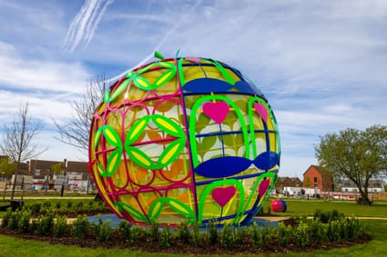 Slices of Peace is inspired by the rich culture and heritage of Kent, in particular, its history of apple growing. The installation consists of a group of brightly-coloured, decorative apple sculptures with an accompanying soundscape composed by Peter Adjaye.